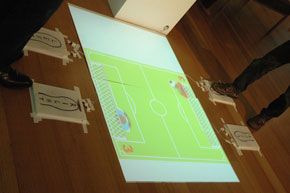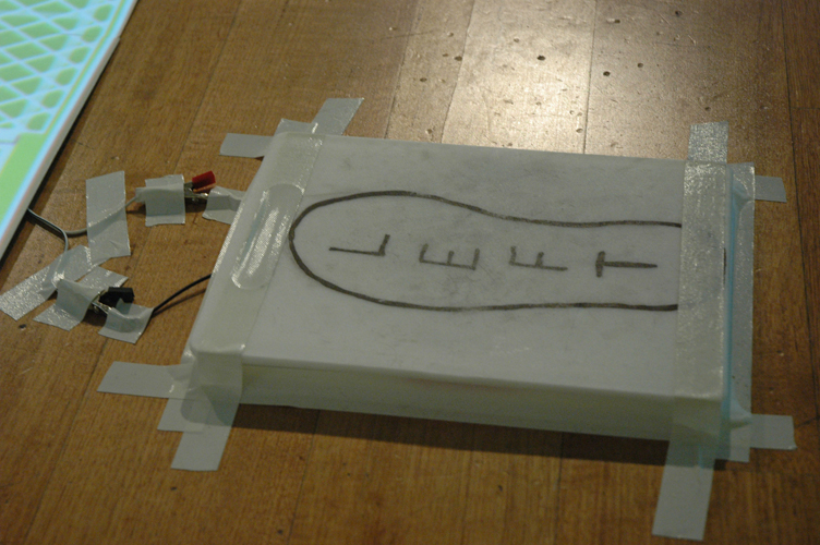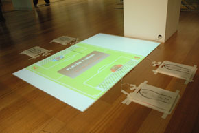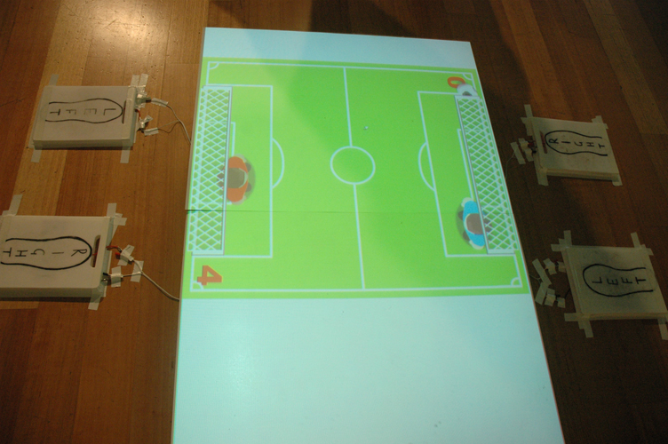 So the aim was to create an interactive that didn't use regular keyboard and mouse inputs. This is the result, a simple soccer themed pong (soccer because the world cup was big at the time). In a group of 2 we split the tasks up so I made the pressure pads and Matt Smith (the rest of my group) made the flash game. The pressure pads were surprisingly simple to construct with the help of a little thing called a KeyWiz.
