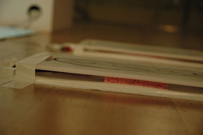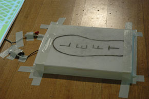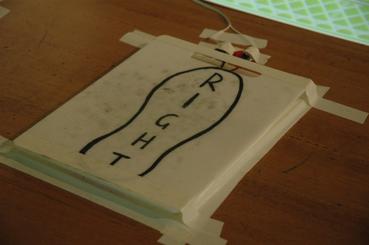 The pressure pads needed to contain 2 pieces of metal for the electrical signal to run along and when you stepped on the pad, to have them touch and complete the circuit. The added problem was to build them to be solid enough to stand up to people stepping on them all day (for the exhibition). The solution was to use regular chopping boards which are tough to begin with, then using two pieces of an everyday wire coat hanger and a kitchen sponge cut up to accommodate both pieces of the coat hanger, the pressure pads were then created.