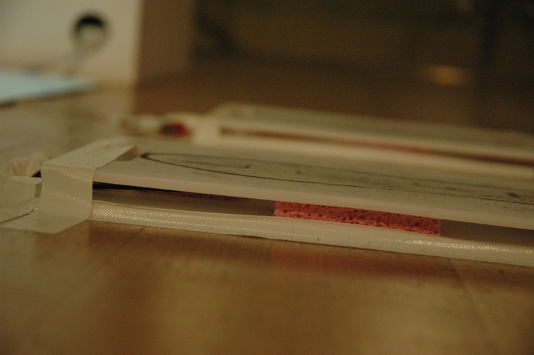 The two pieces of coat hanger perpendicular one piece on each of the chopping boards, and then pieces of sponge on either end to keep them apart, so that you needed to step on them to make them work. Wire it all up there you have 4 working pressure pads for our soccer pong game.